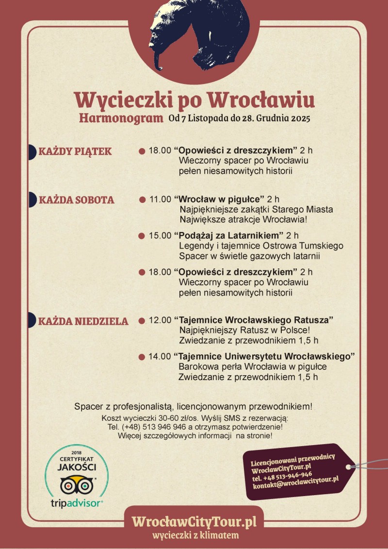 „Tajemnice, legendy i czarownice…” Przepiękna trasa turystyczna obejmująca największe atrakcje Starego Miasta. Mnóstwo ciekawych historii i tajemniczych miejsc. Legenda o Dzwonie Grzesznika – na życzenie wejście na Mostek Czarownic i panorama na Starówkę. Wycieczka po Wrocławiu dla dzieci i dorosłych.