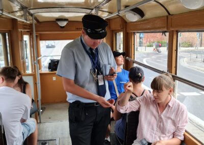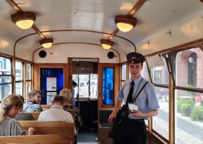👉 Auf Wunsch kontrolliert der Schaffner mit Schaffnermütze die Fahrkarten mit einem Locher. Fahrgäste ohne gültige Fahrkarte müssen an der nächsten Haltestelle aussteigen! 😉 Der zusätzliche Preis beträgt 30 € pro Gruppe.