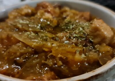 „Schlesische Sauerteigsuppe“ Breslauer żurek (saure Roggensuppe) ist ein Gericht, das eine landesweite Tradition mit den regionalen Besonderheiten Niederschlesiens verbindet. Obwohl es auf klassischem Roggensauerteig basiert, weist die Breslauer Variante oft einige einzigartige Merkmale auf. Breslauer żurek wird mit aromatischen Pilzen (oft Steinpilzen oder Lorbeer-Steinpilzen) verfeinert, was ihm einen tieferen, waldartigen Geschmack verleiht, und wird außerdem mit herzhafter, regionaler Wurst serviert. In Breslau gilt es als Markenzeichen der Stadt, żurek in einem ausgehöhlten, knusprigen Laib handwerklich hergestellten Brotes zu servieren.