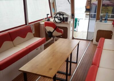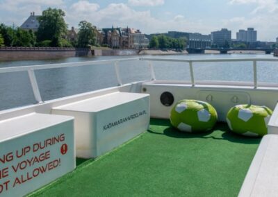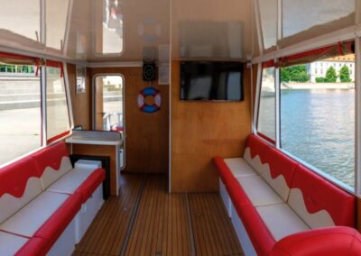 Stateczek – katamaran to mała jednostka pływająca na 13 os. Zaprojektowana, aby podziwiać panoramę dookoła rzeki z perspektywy 360 stopni! Stateczek posiada górny pokład widokowy! Bezpieczny, doskonale widoczny na rzece, na pokładzie kamizelki ratunkowe.