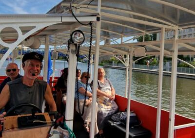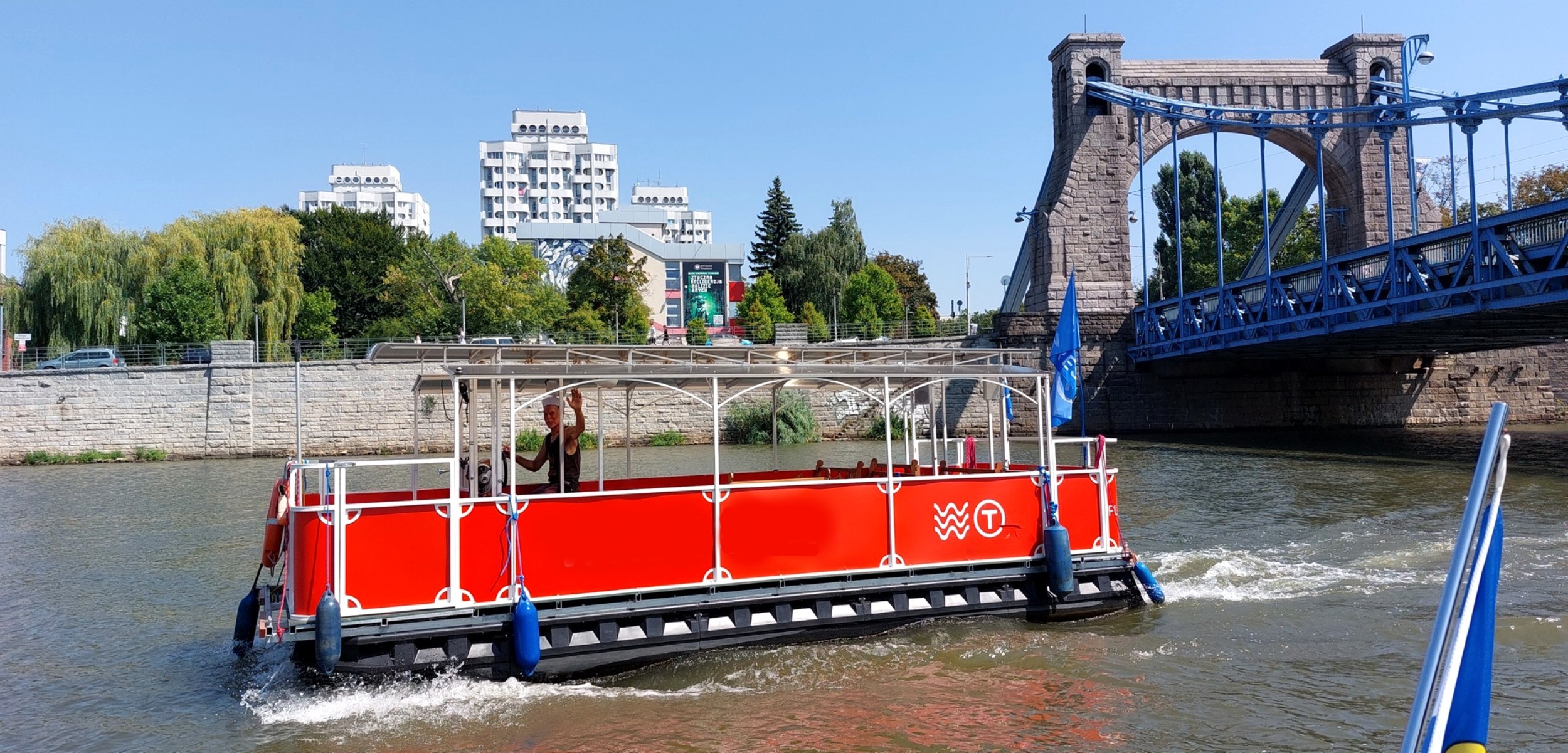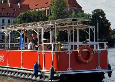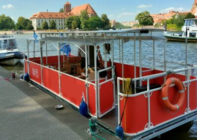 Stateczek – katamaran, tramwaj rzeczny po Odrze to mała jednostka pływająca na 12 os. Zaprojektowana, aby podziwiać panoramę dookoła rzeki z perspektywy 360 stopni! W lecie przyjemna przewiewna przestrzeń – zimą ogrzewana, zamknięta. Stateczek zaprojektowanyna wzór dawnego, przedwojennego tramwaju miejskiego Berolina z roku 1913. Bezpieczny, doskonale widoczny na rzece, na pokładzie kamizelki ratunkowe. Łatwe wejście na pokład, nawet dla osób niepełnosprawnych!